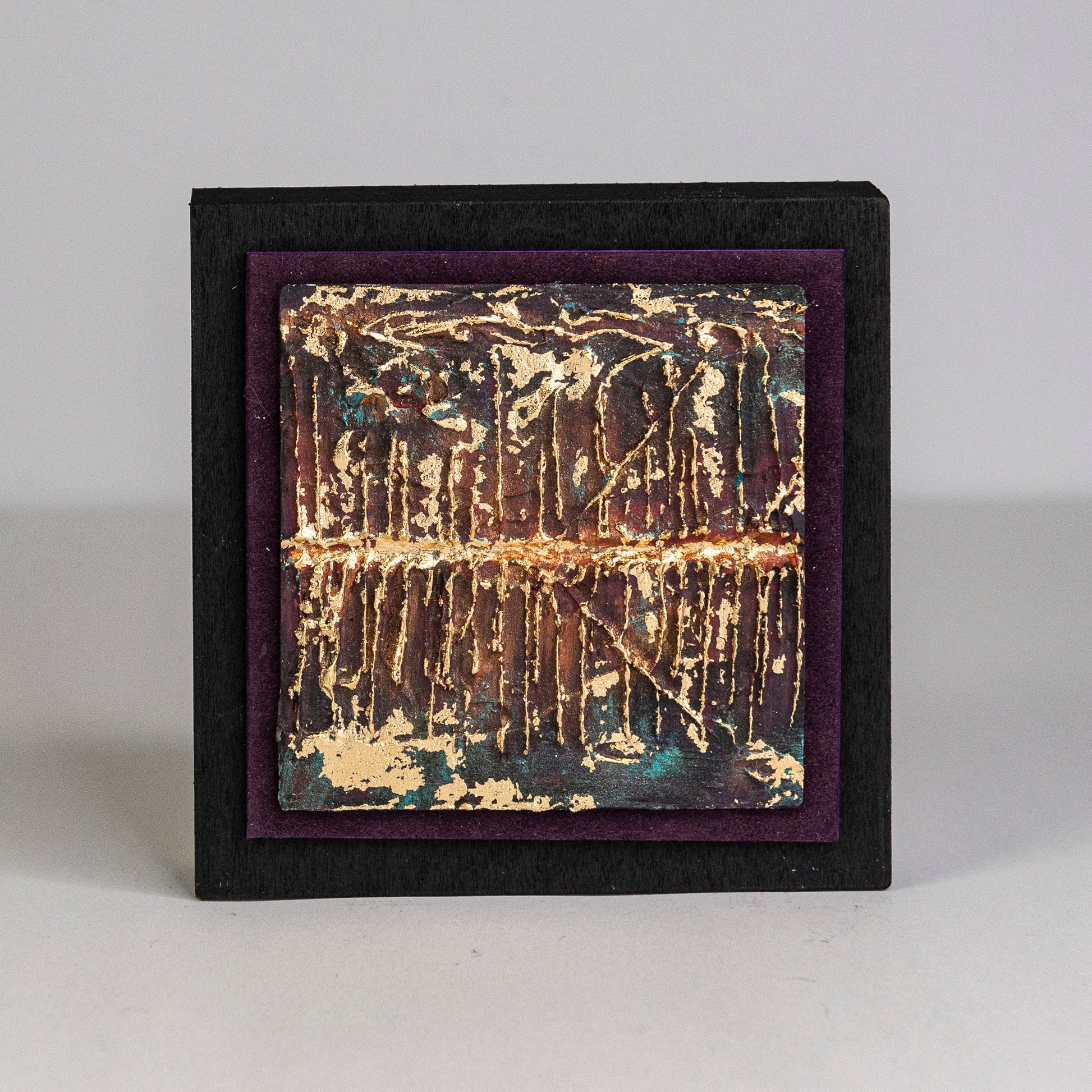 One-of-a-kind! Each is a mixed media/metal hand-painted metal square on a 4x4" wood panel which stands on it's own or can hang on your wall.