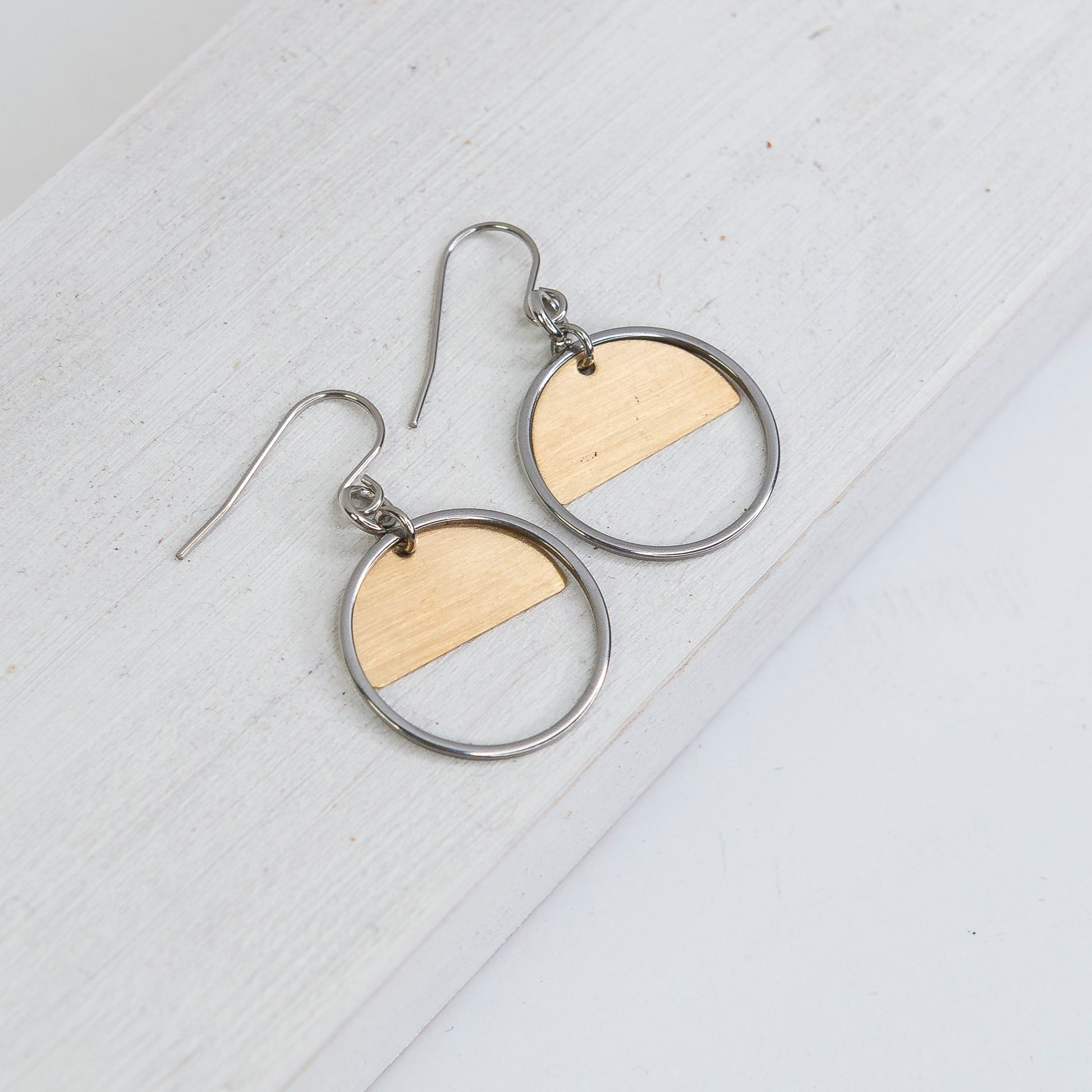 These intriguing and versatile earrings combine pewter and bronze for a simple, understated look, with a golden bronze 'sunrise' emerging in the circle's center.