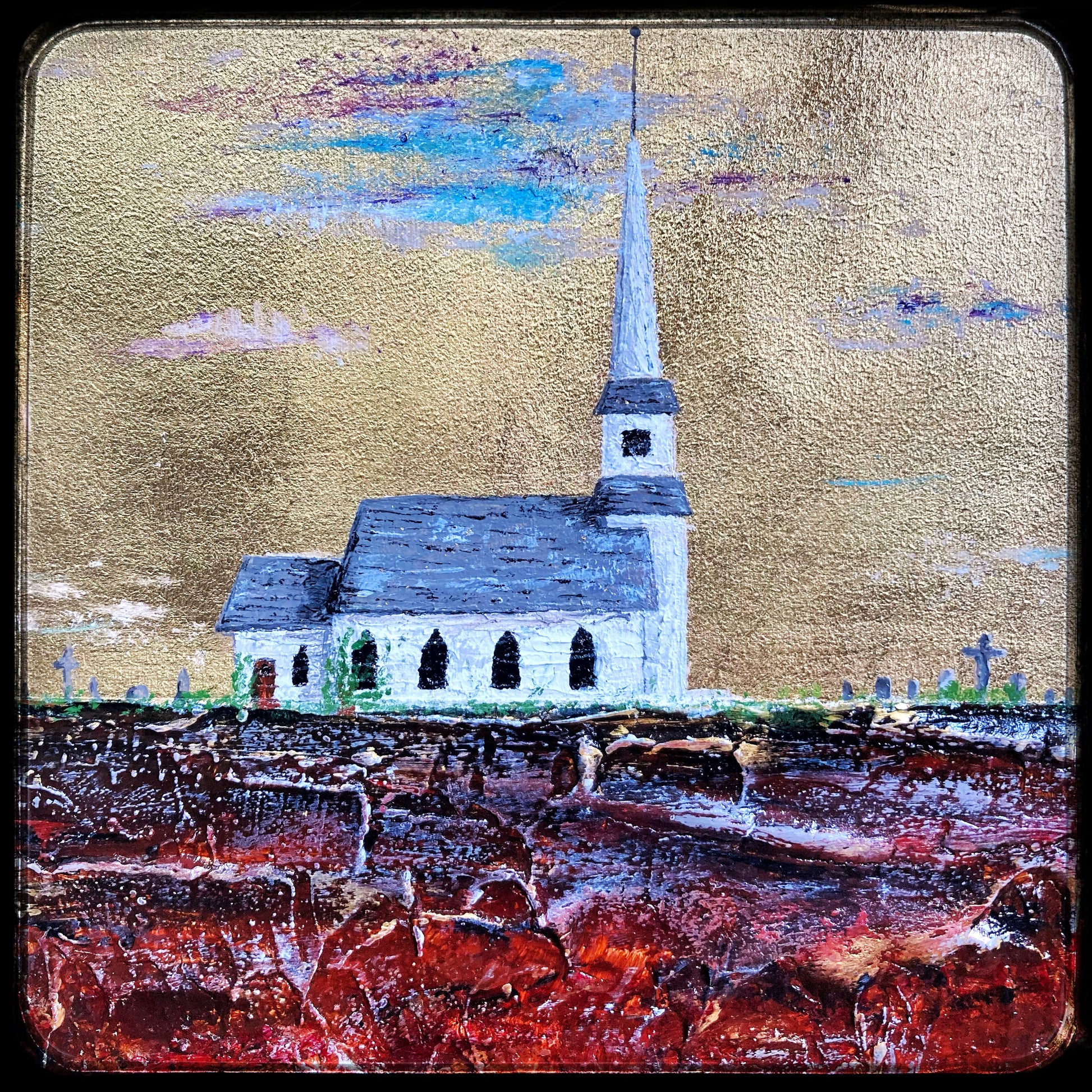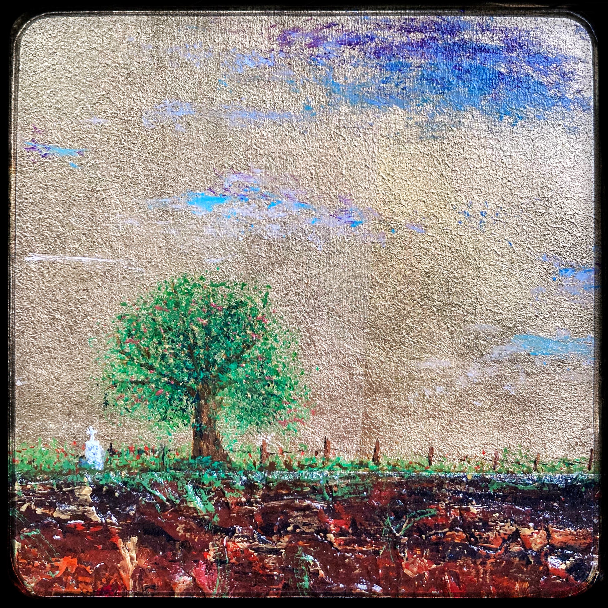 This style and method of painting has been uniquely created by the artist. It utilizes acrylic media, metal leaf and mica to give a reflective finish that changes depending on the light in the room and the position of the viewer.