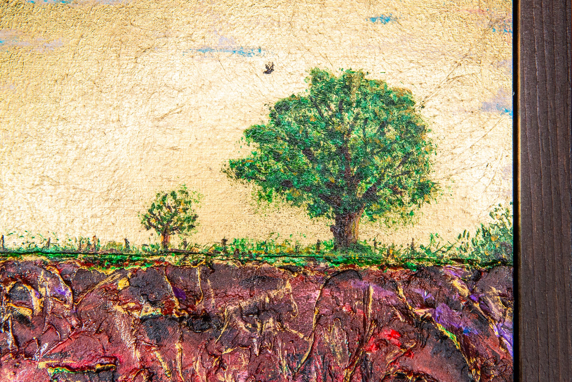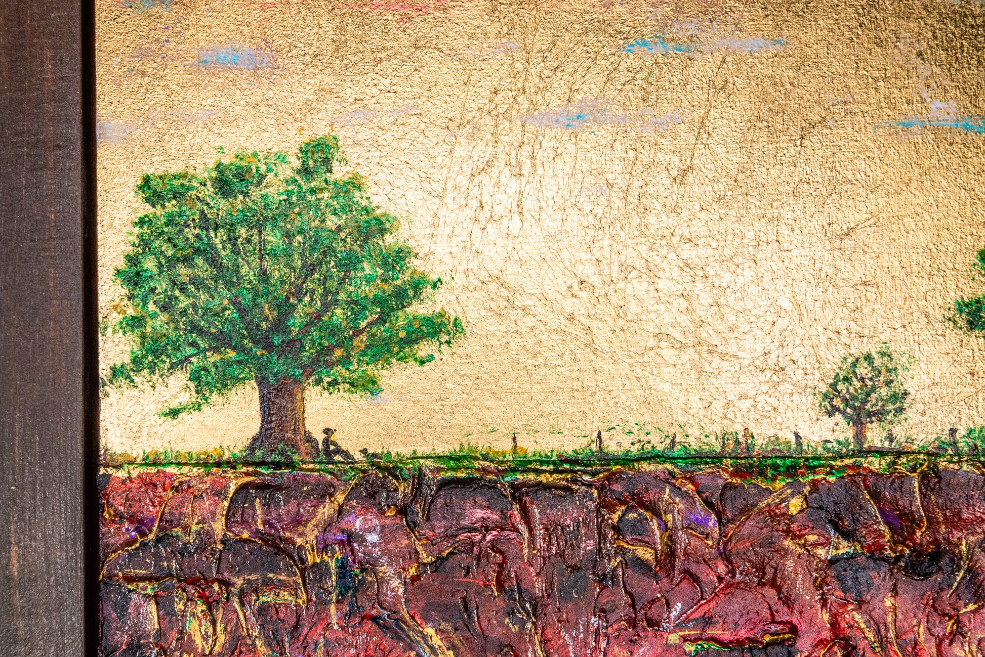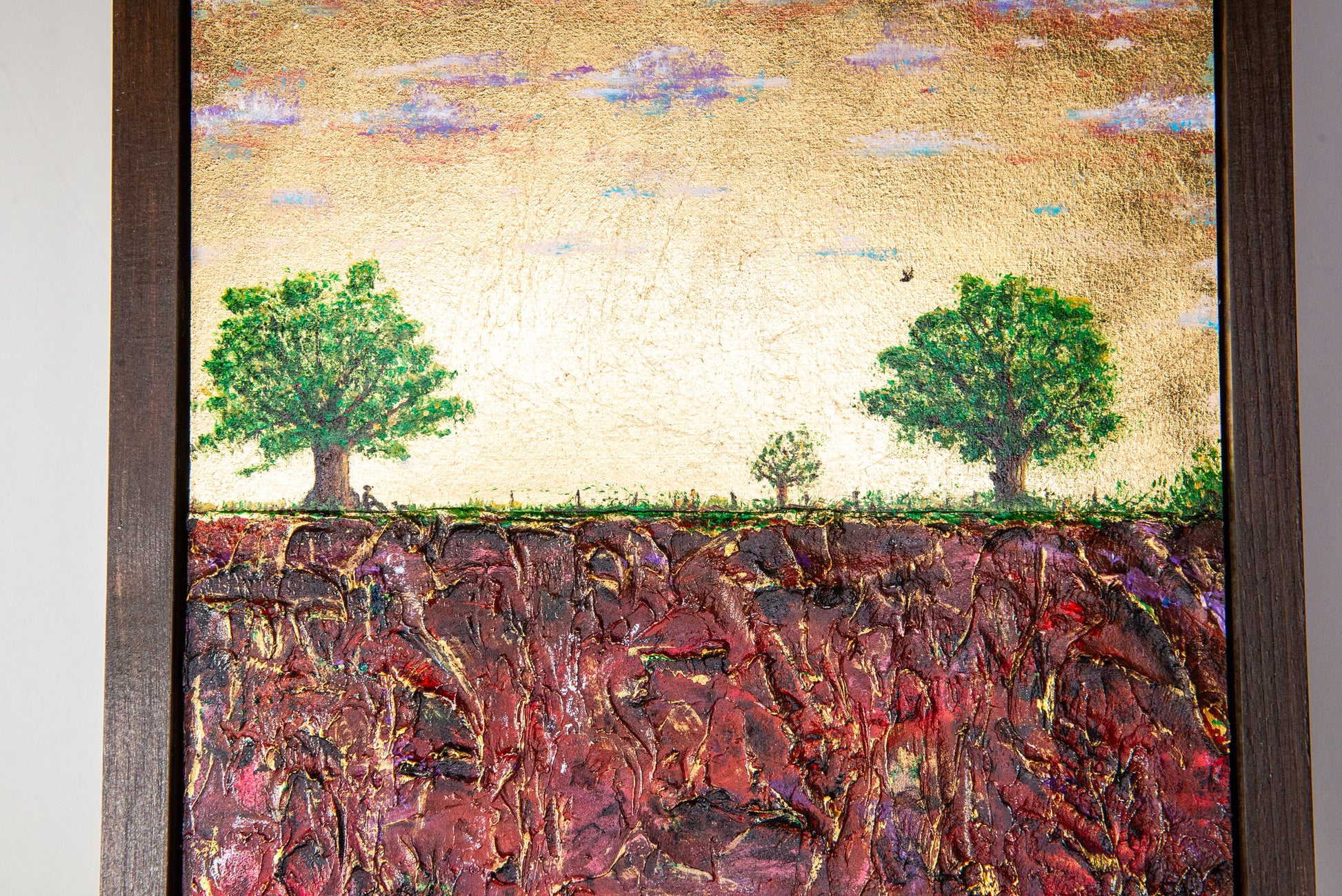 In a multitude of ways, this painting is reflective. As it subtly changes with the light in your home throughout the day, imagine yourself in that landscape, embraced by the passage of time. This nuanced and highly textural piece draws the eye and brings warmth and light to a room.